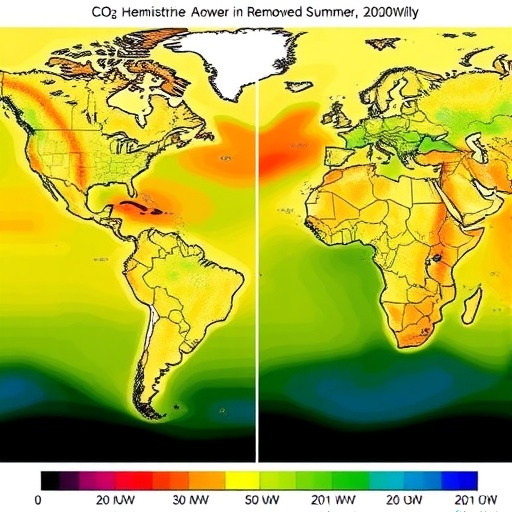 Using advanced Earth system modeling techniques, the authors simulated scenarios involving rapid CO2 drawdown and examined subsequent seasonal length responses over multiple decades. These models integrate atmospheric, oceanic, and land surface processes with unprecedented granularity, allowing the team to dissect hemispheric differences in summer duration changes with precision. The results unveiled a striking dichotomy: while the Northern Hemisphere exhibited a pronounced extension of summer length, the Southern Hemisphere paradoxically experienced a contraction in summer duration upon CO2 removal.